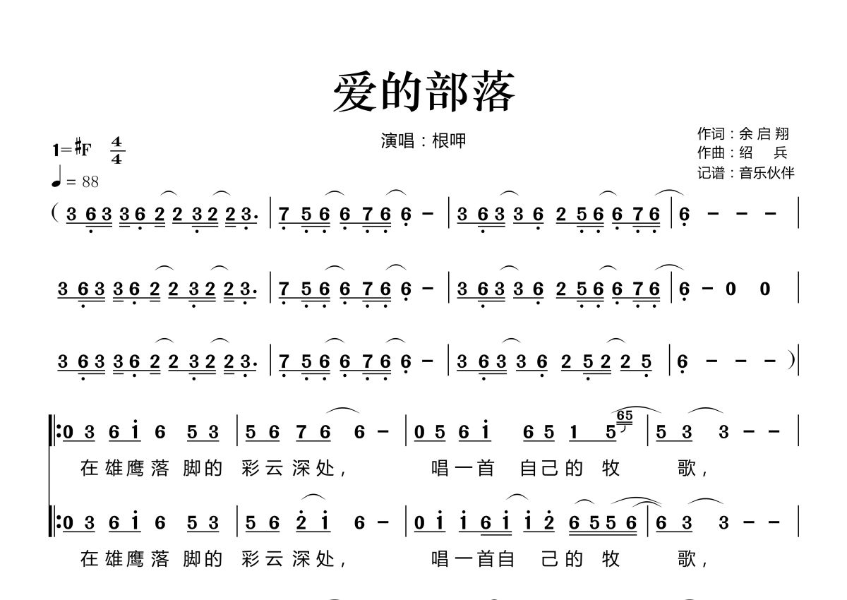 曲谱介绍: 根呷《爱的部落》,音乐伙伴编配出品,共有2张高清图谱,免翻页排版设计。