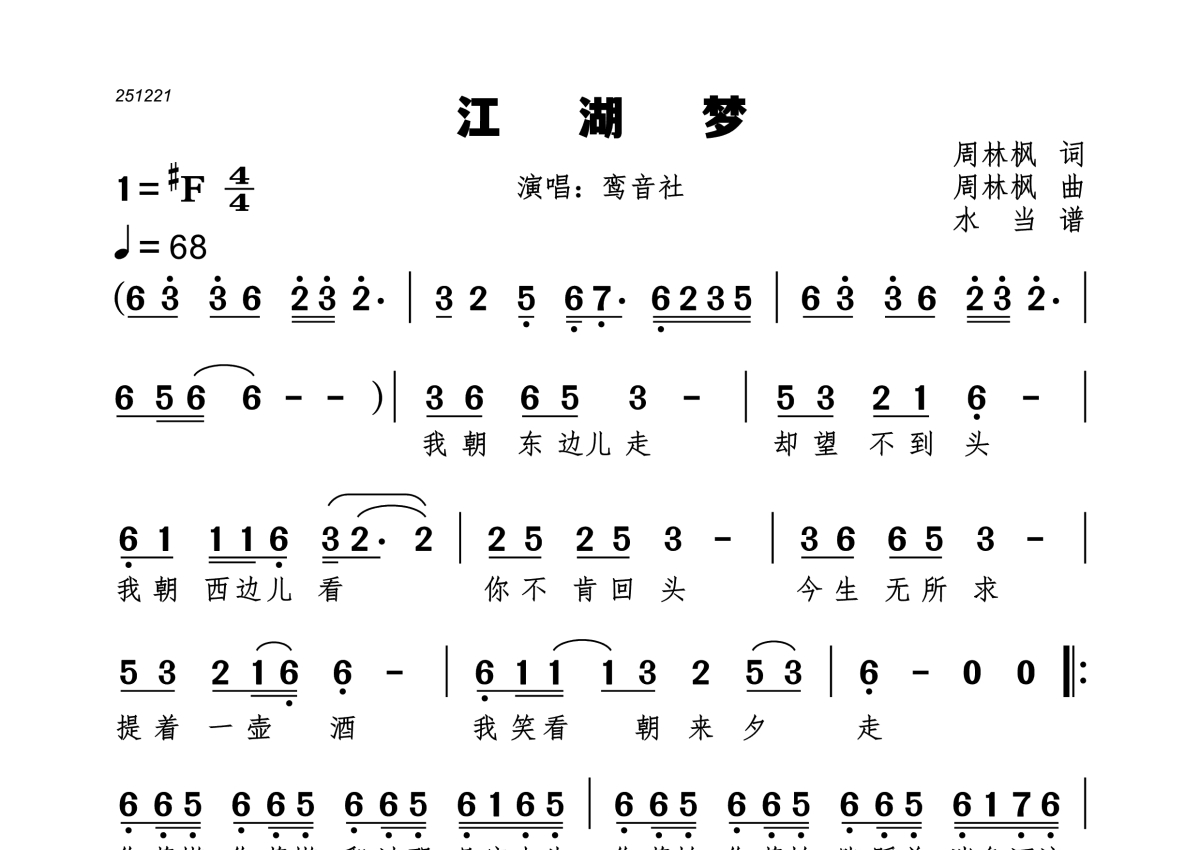 曲谱介绍: 鸾音社《江湖梦》,水当编配出品,共有1张高清图谱,免翻页排版设计。
