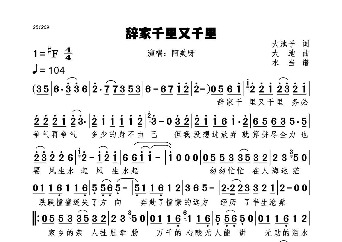 曲谱介绍: 阿美呀《辞家千里又千里》,水当编配出品,共有1张高清图谱,免翻页排版设计。