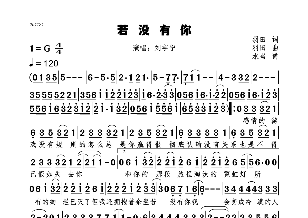 曲谱介绍: 刘宇宁《若没有你》,水当编配出品,共有1张高清图谱,免翻页排版设计。