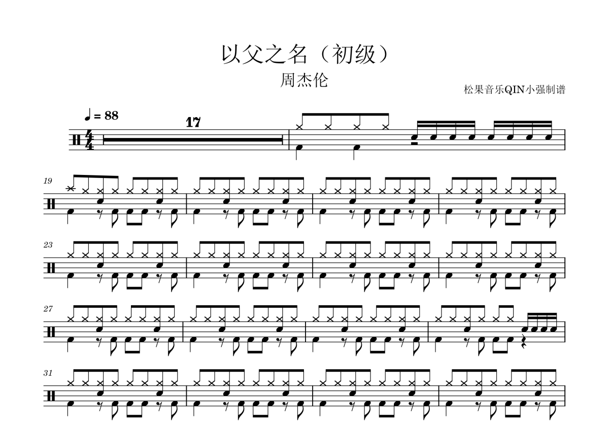 曲谱介绍: 初级《以父之名(初级)》架子鼓谱,松果音乐QIN小强编配出品,共有3张高清图谱。