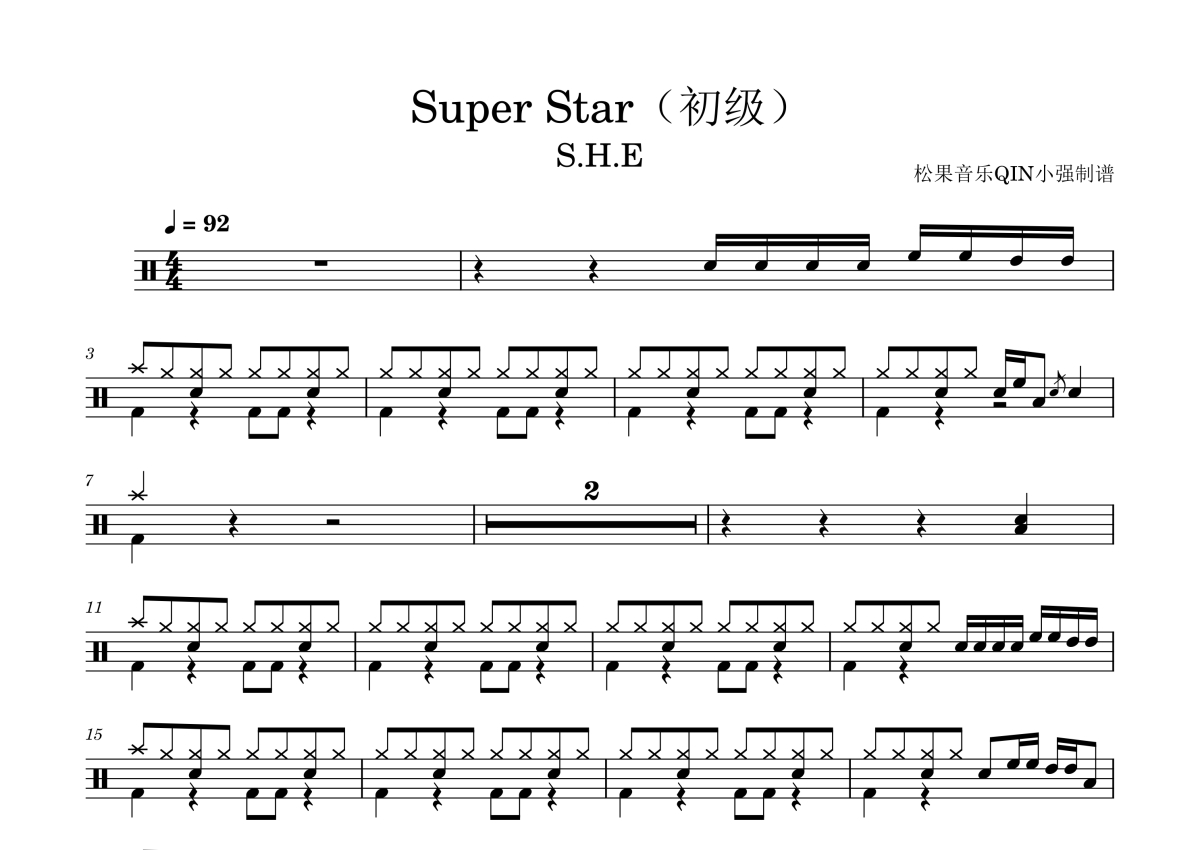 曲谱介绍: 初级《Superstar(初级)》架子鼓谱,松果音乐QIN小强编配出品,共有2张高清图谱,免翻页排版设计。