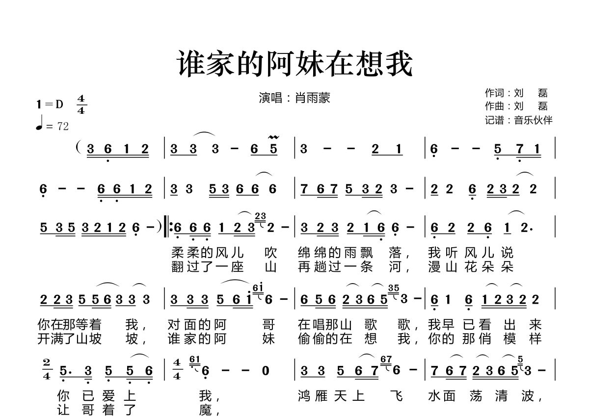 曲谱介绍: 肖雨蒙《谁家的阿妹在想我》,音乐伙伴编配出品,共有1张高清图谱,免翻页排版设计。