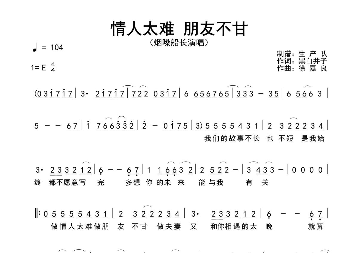 曲谱介绍: 烟嗓船长《情人太难朋友不甘》原版简谱,生产队编配出品,共有1张高清图谱,免翻页排版设计。