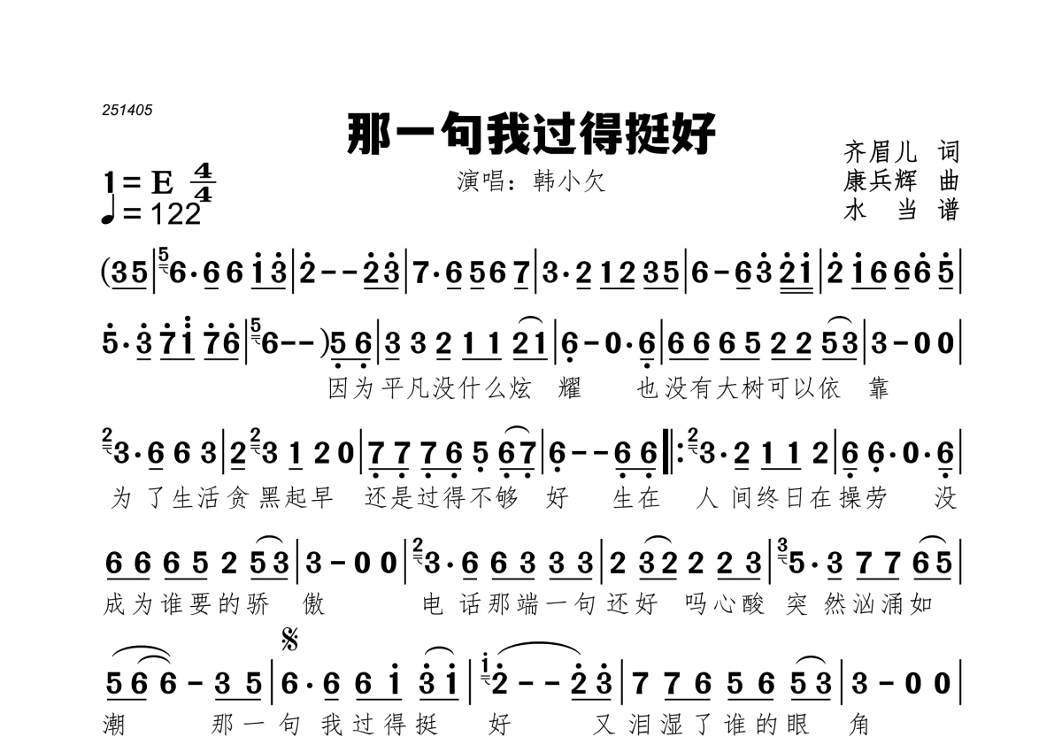 曲谱介绍: 韩小欠《那一句我过得挺好》,水当编配出品,共有1张高清图谱,免翻页排版设计。