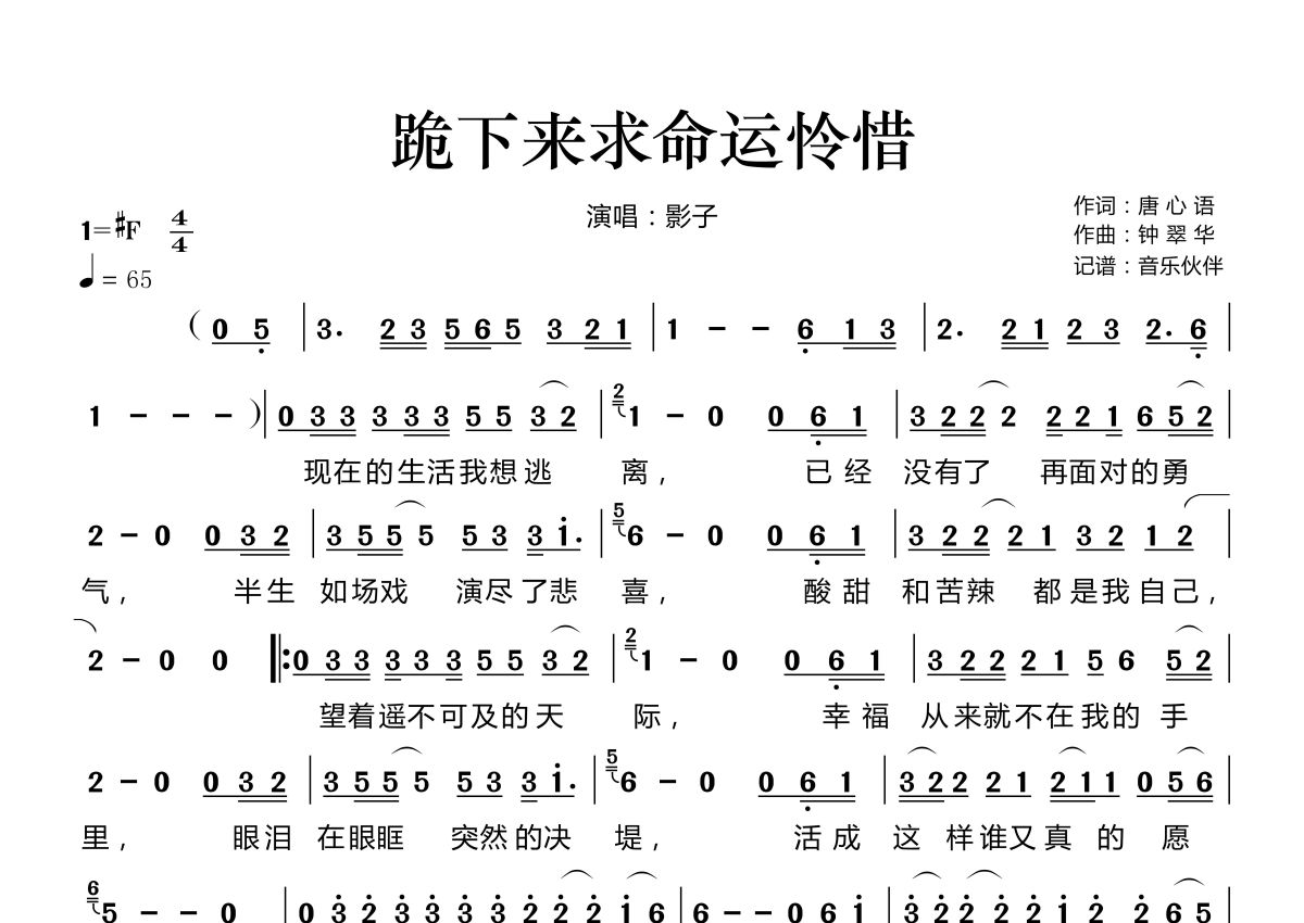 曲谱介绍: 影子《跪下来求命运怜惜》,音乐伙伴编配出品,共有1张高清图谱,免翻页排版设计。