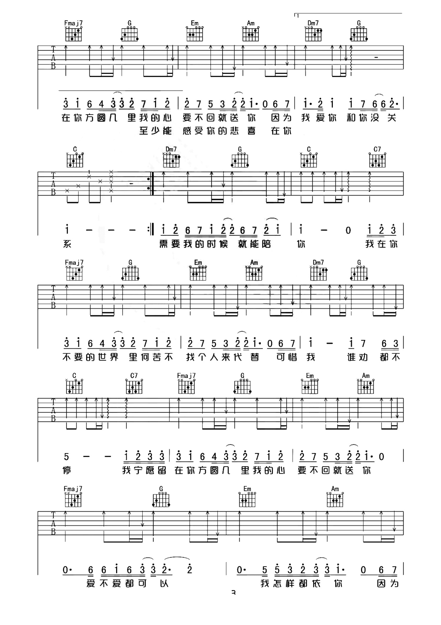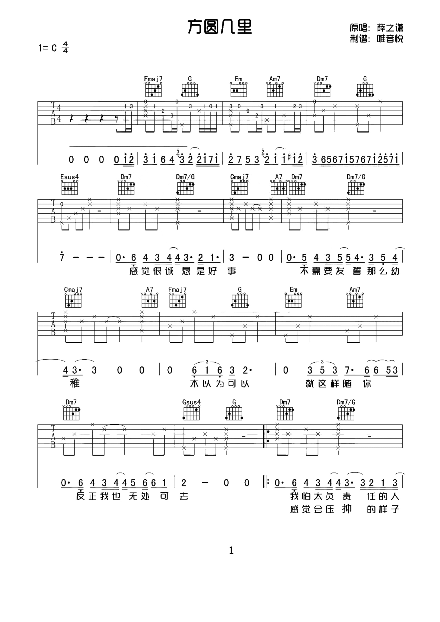 曲谱介绍: 薛之谦《方圆几里》吉他谱_C调吉他弹唱谱