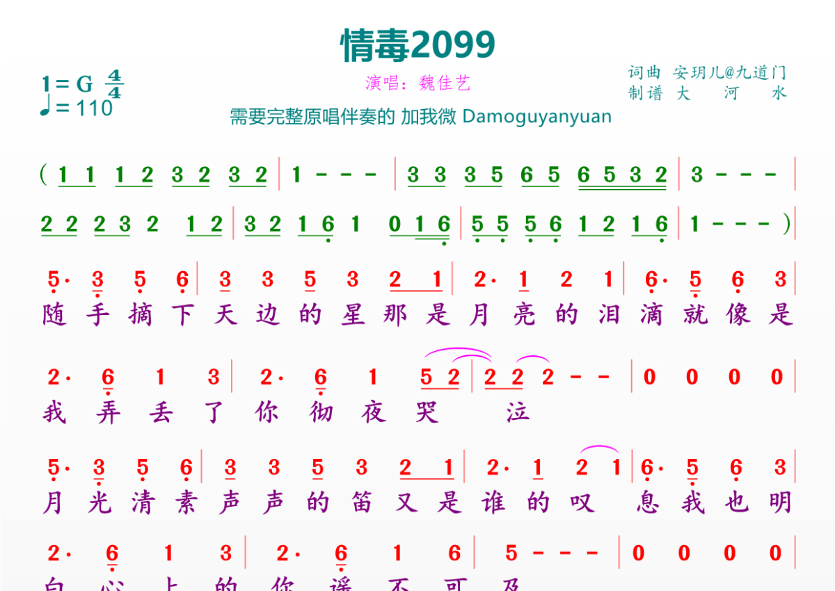 曲谱介绍: 魏佳艺《情毒2099》,临海雪原编配出品,共有1张高清图谱,免翻页排版设计。