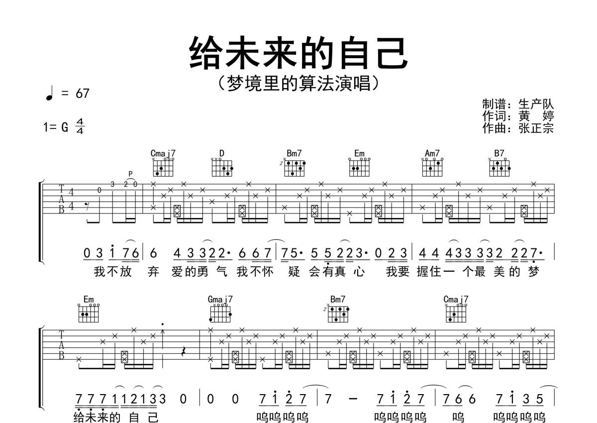 曲谱介绍: 梦境里的算法《给未来的自己》吉他弹唱谱,采用G调指法编配精编完美版,生产队编配出品,共有3张高清图谱。