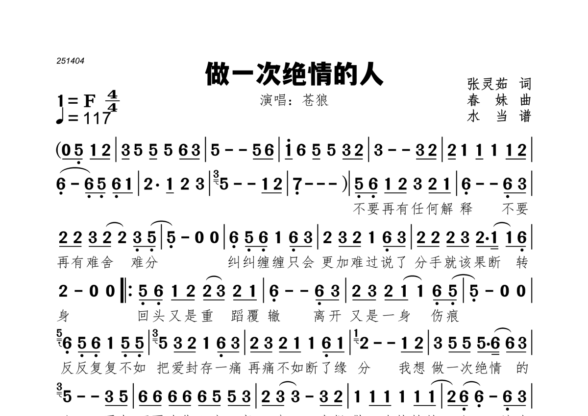 曲谱介绍: 苍狼《做一次绝情的人》,水当编配出品,共有1张高清图谱,免翻页排版设计。