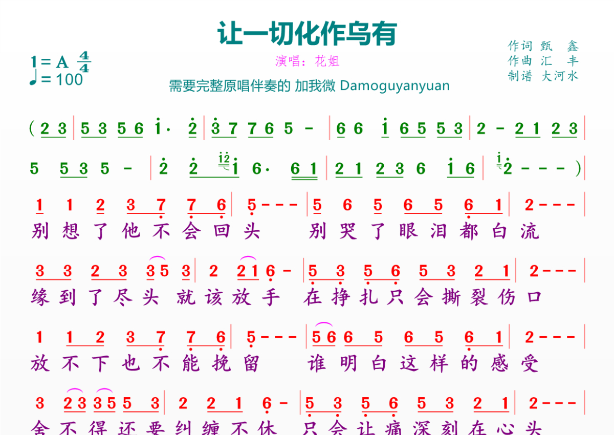 曲谱介绍: 花姐《让一切化作乌有》,临海雪原编配出品,共有1张高清图谱,免翻页排版设计。