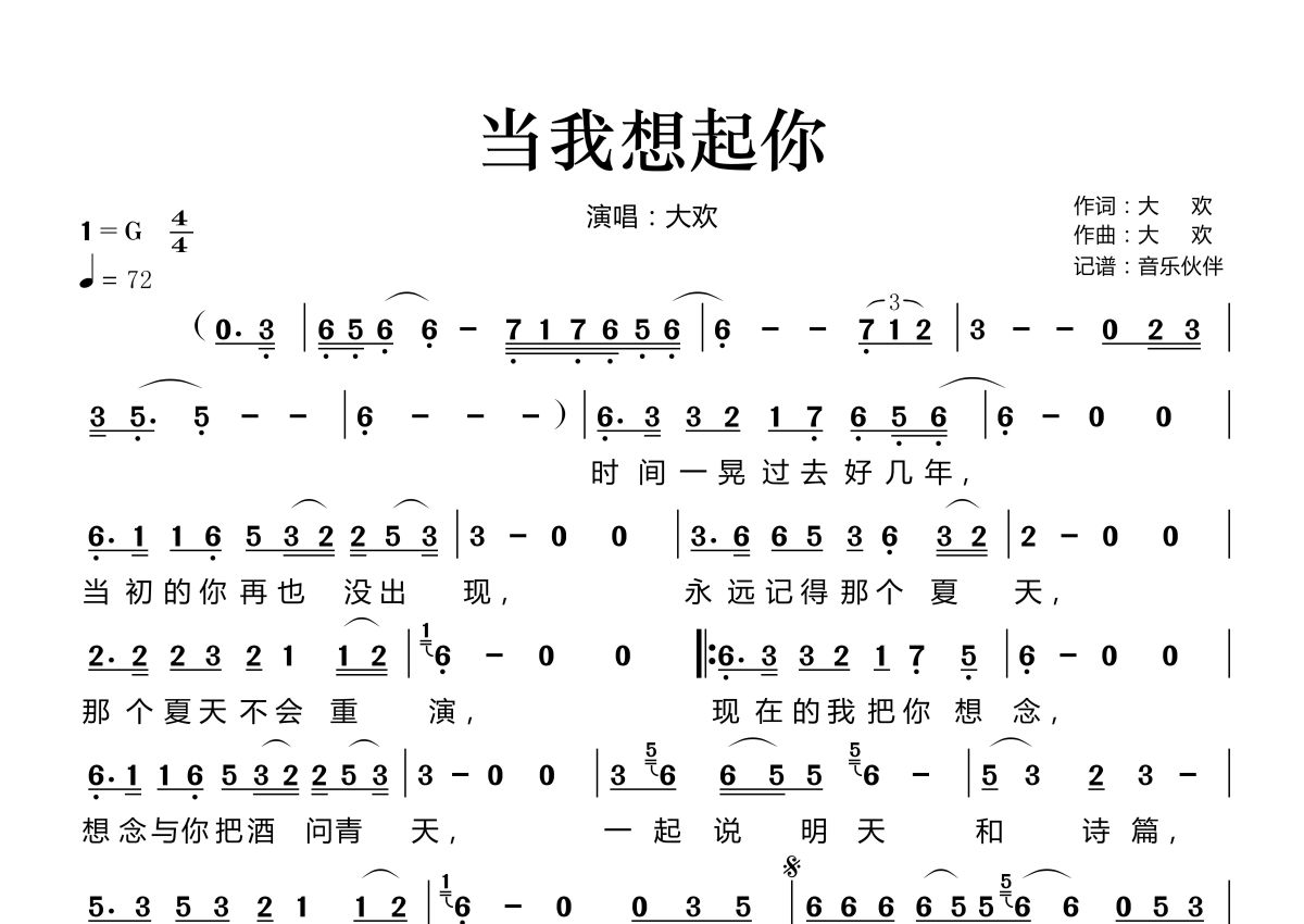 曲谱介绍: 大欢《当我想起你》,音乐伙伴编配出品,共有1张高清图谱,免翻页排版设计。