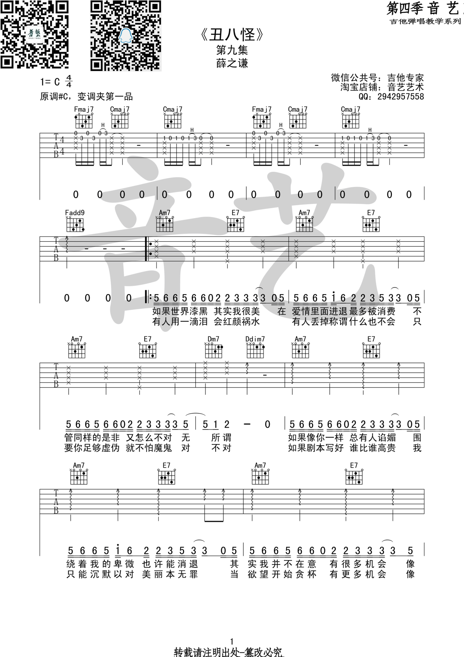 丑八怪吉他谱 - 薛之谦 - C调吉他弹唱谱