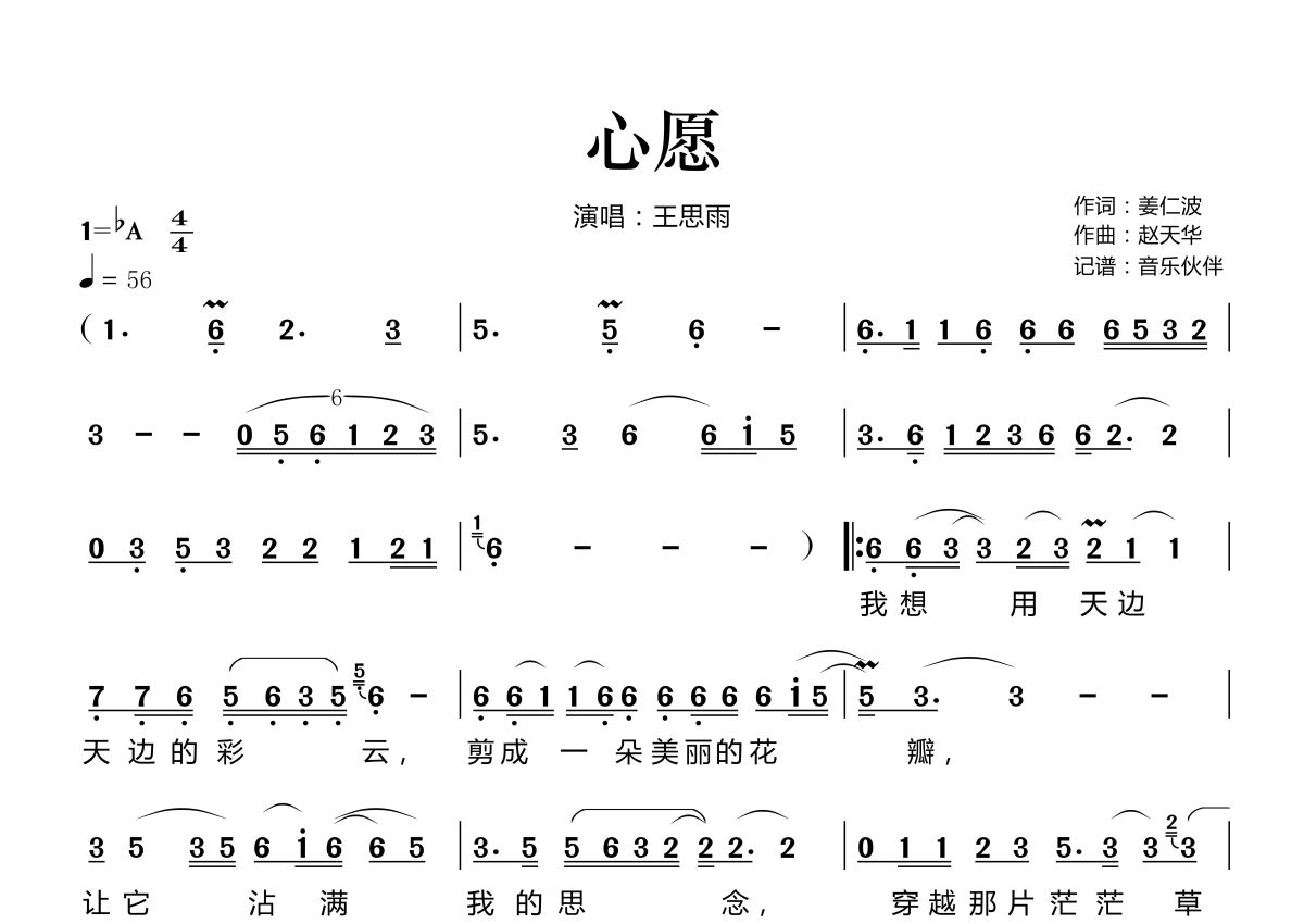 曲谱介绍: 王思雨《心愿》,音乐伙伴编配出品,共有2张高清图谱,免翻页排版设计。