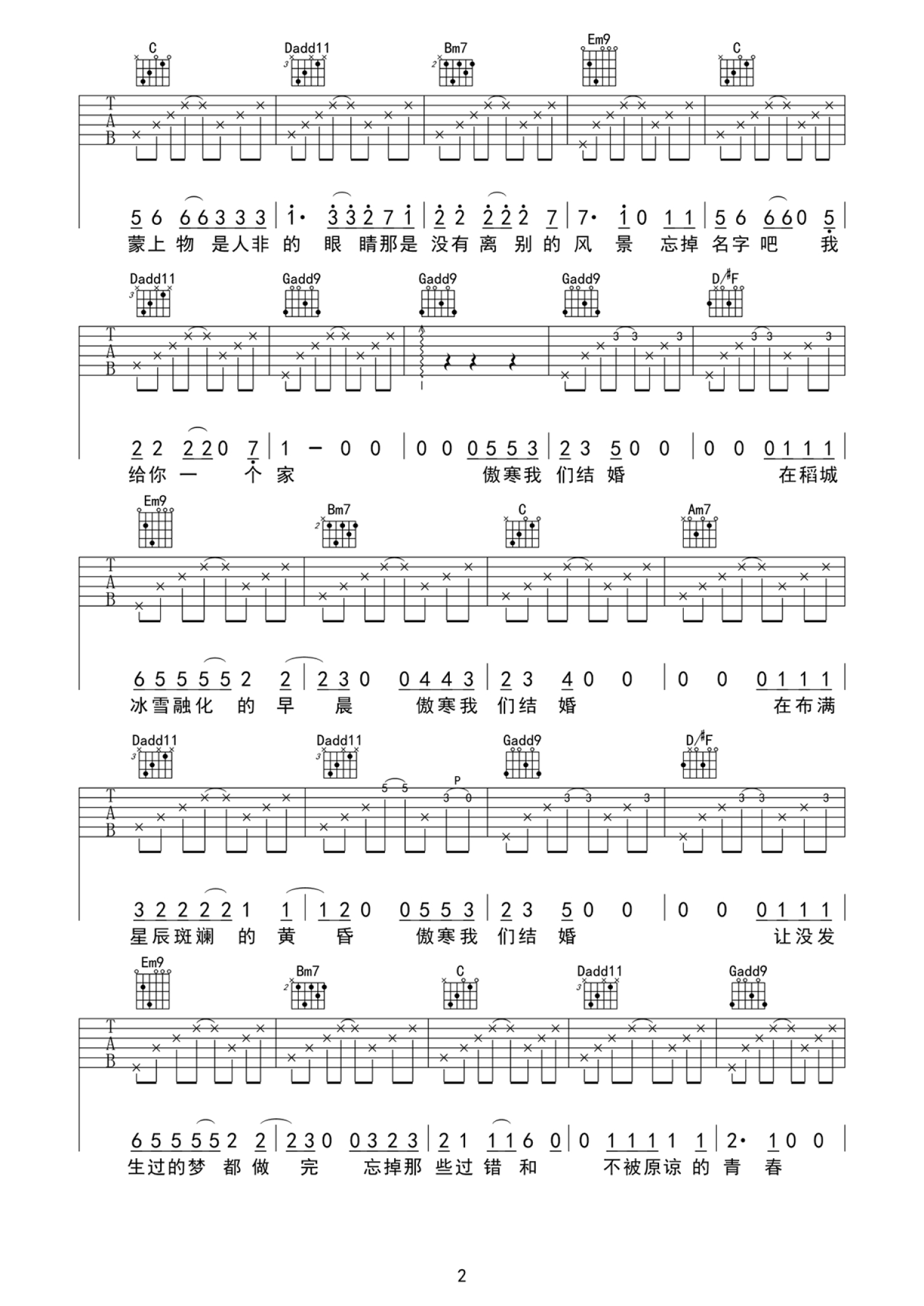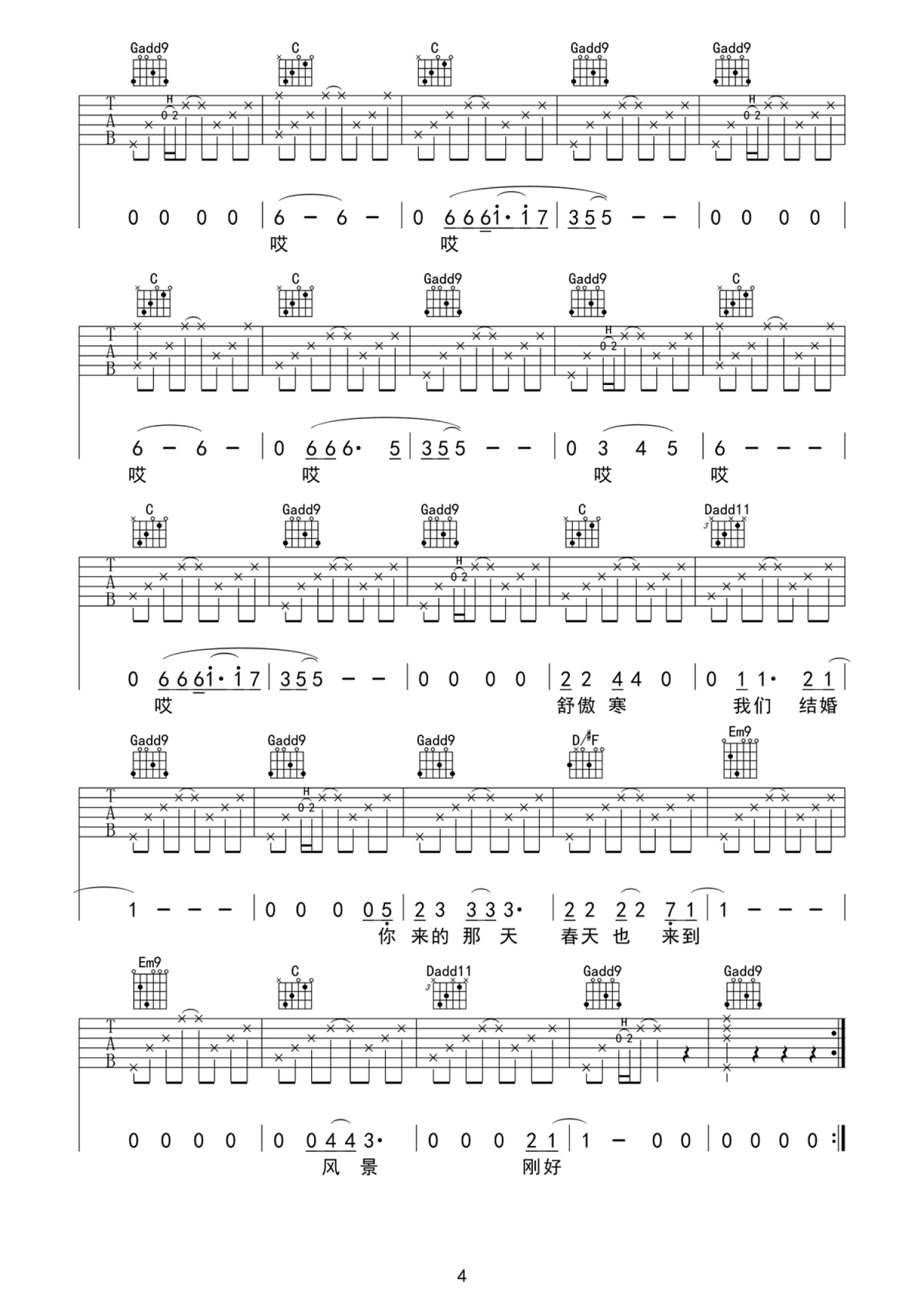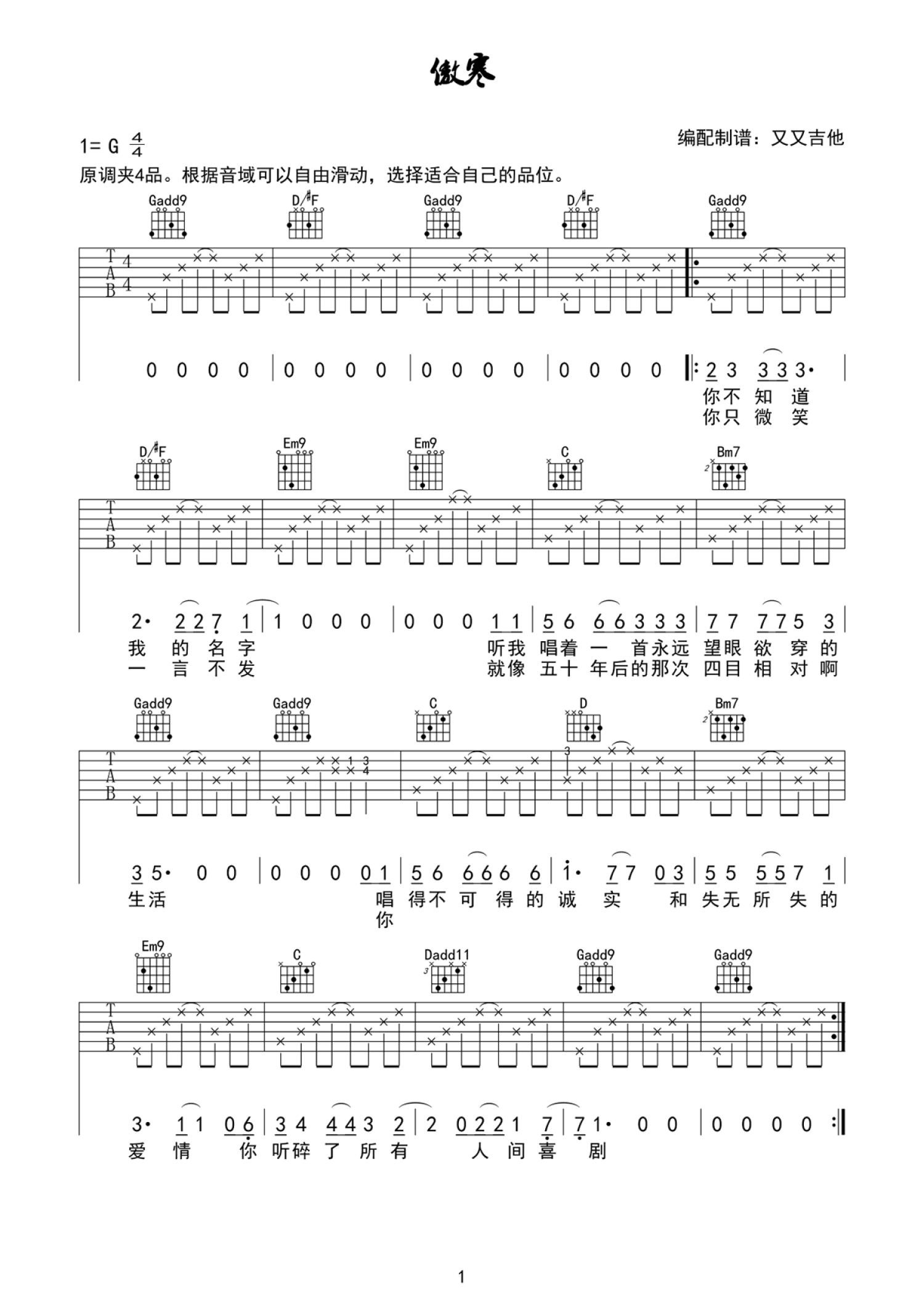 曲谱介绍: 傲寒吉他谱,马頔演唱的《傲寒》六线谱,四张图片谱。原调G,变调夹夹4品,可根据音域自由滑动,选择适合自已的品位。   这首《傲寒》是马頔为女友舒傲寒所创作的歌曲。如歌中所唱所往,已实现。是不是更像描述的一幅画儿美的不真实。还有人问你是听傲寒还是南山南,我都听哈哈。你都弹了么