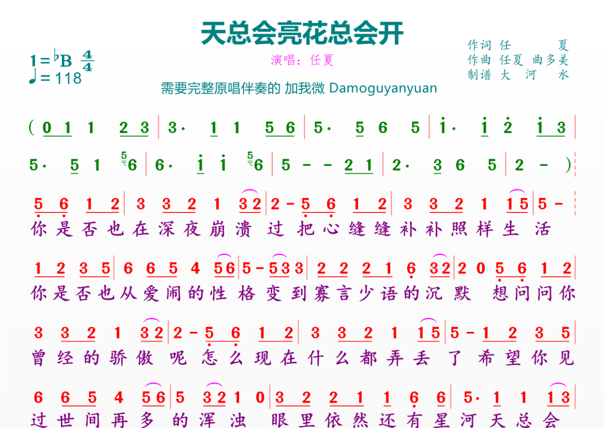 曲谱介绍: 任夏《天总会亮花总会开》,临海雪原编配出品,共有1张高清图谱,免翻页排版设计。