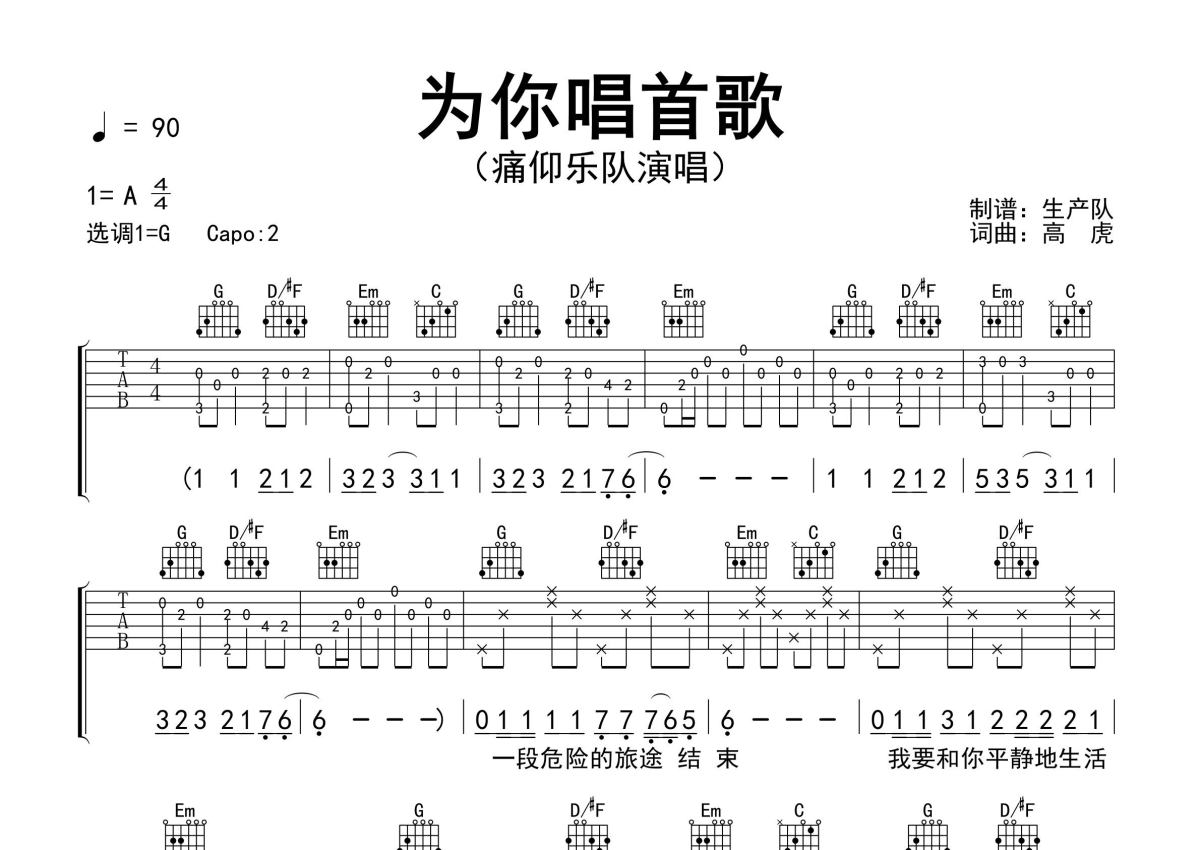曲谱介绍: 痛仰乐队《为你唱首歌》吉他弹唱谱,采用G调指法编配精编完美版,生产队编配出品,共有3张高清图谱。