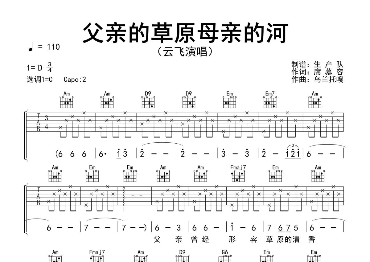 曲谱介绍: 云飞《父亲的草原母亲的河》吉他弹唱谱,采用C调指法编配精编完美版,生产队编配出品,共有3张高清图谱。