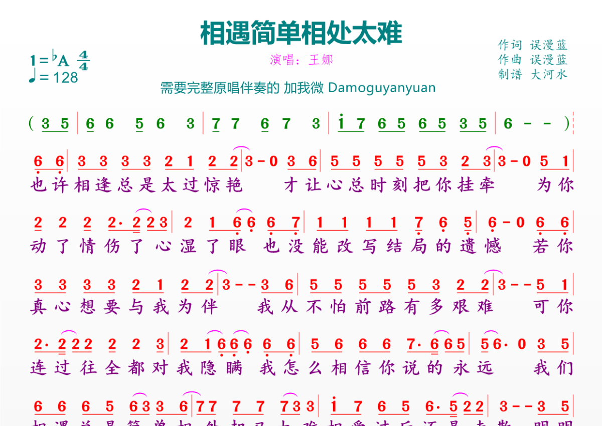 曲谱介绍: 王娜《相遇简单相处太难》,临海雪原编配出品,共有1张高清图谱,免翻页排版设计。