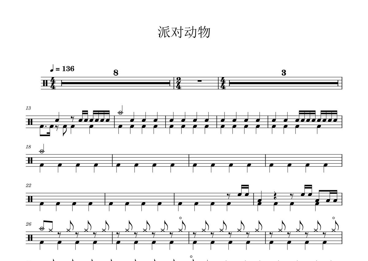 曲谱介绍: 五月天《派对动物》架子鼓谱,音符喷血者编配出品,共有3张高清图谱。