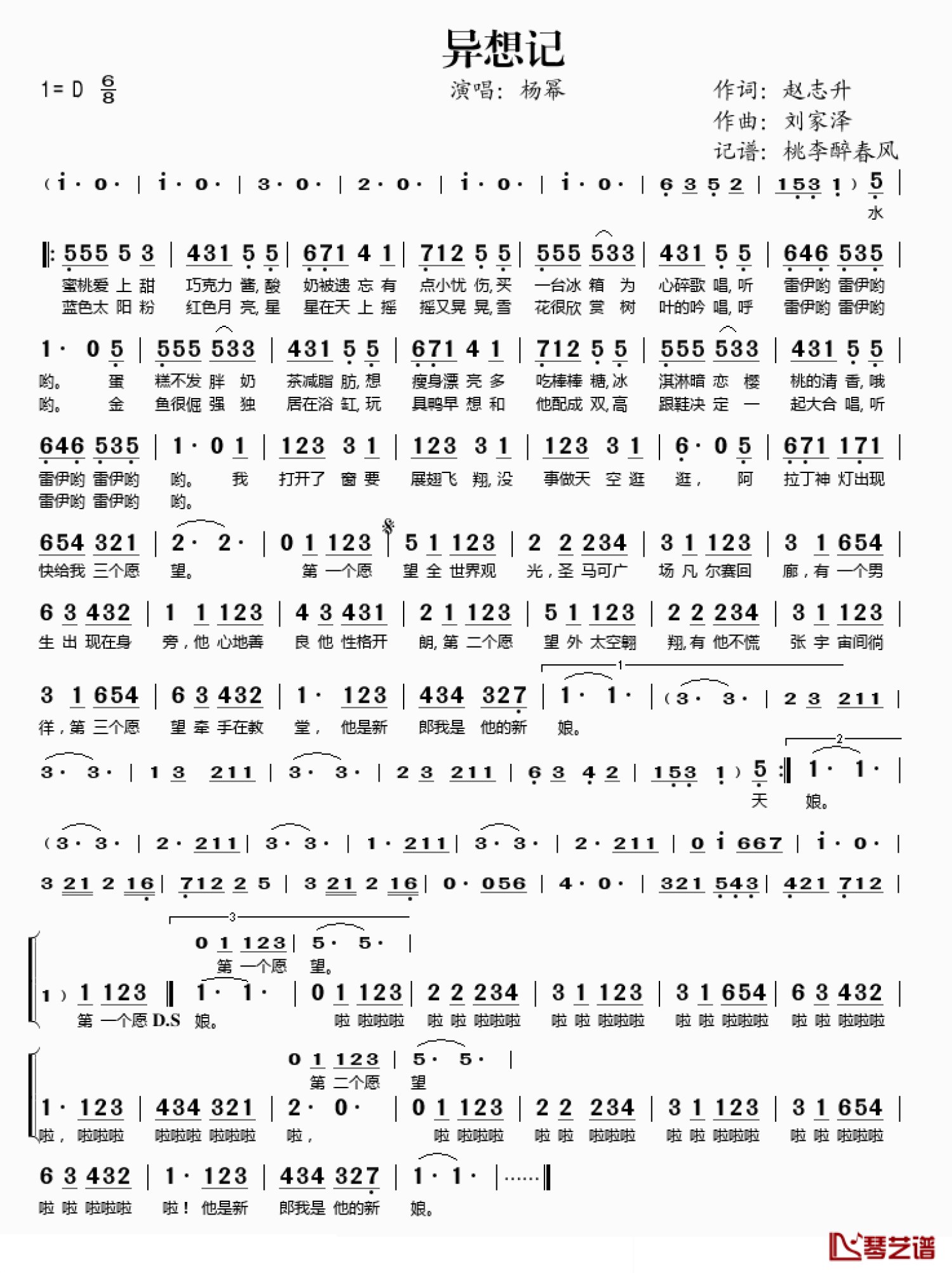 曲谱介绍: 杨幂《异想记》歌词_简谱