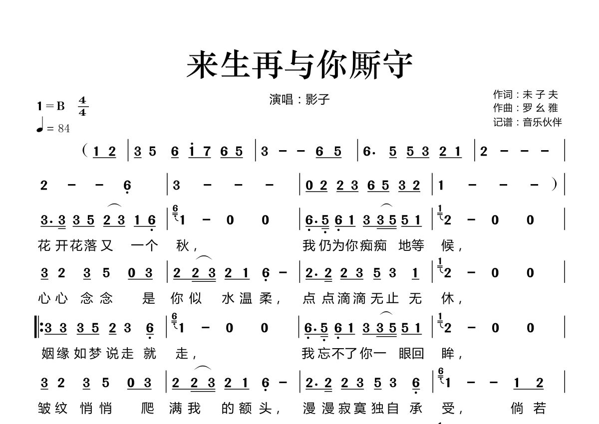 曲谱介绍: 影子《来生再与你厮守》,音乐伙伴编配出品,共有1张高清图谱,免翻页排版设计。