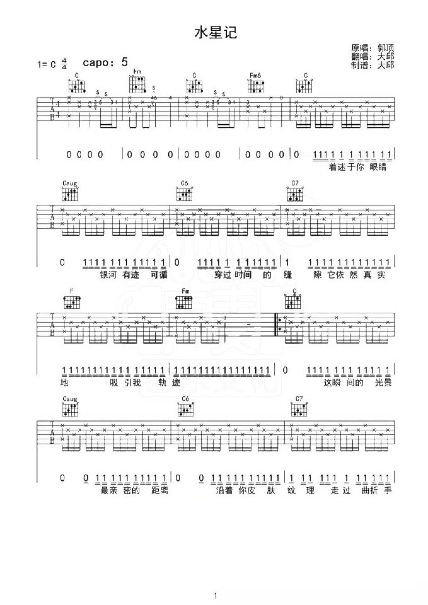 曲谱介绍: 郭顶《水星记》吉他谱_C调吉他弹唱谱