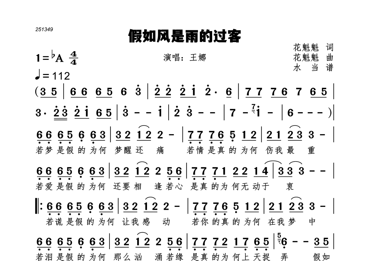 曲谱介绍: 王娜《假如风是雨的过客》,水当编配出品,共有1张高清图谱,免翻页排版设计。