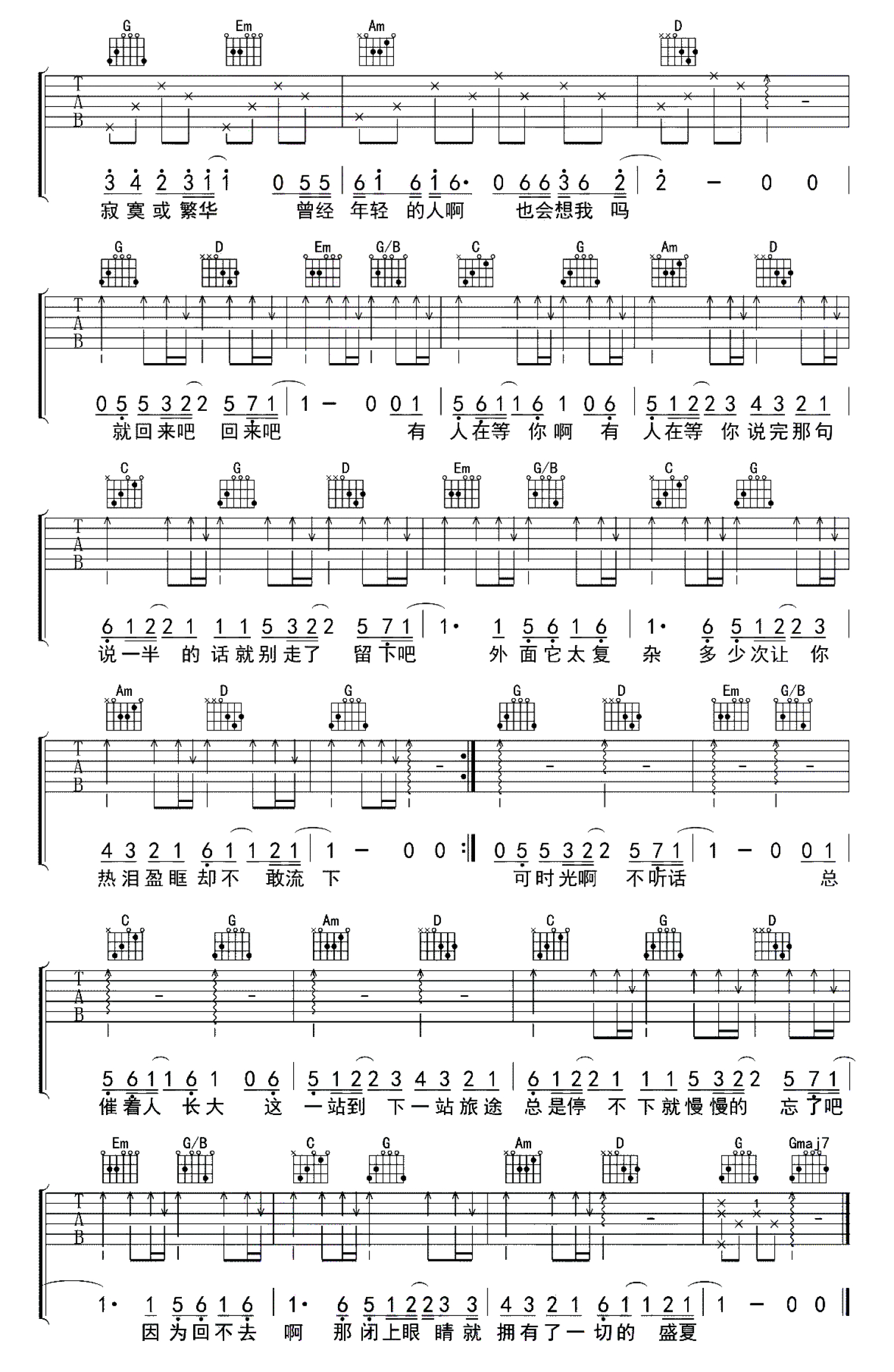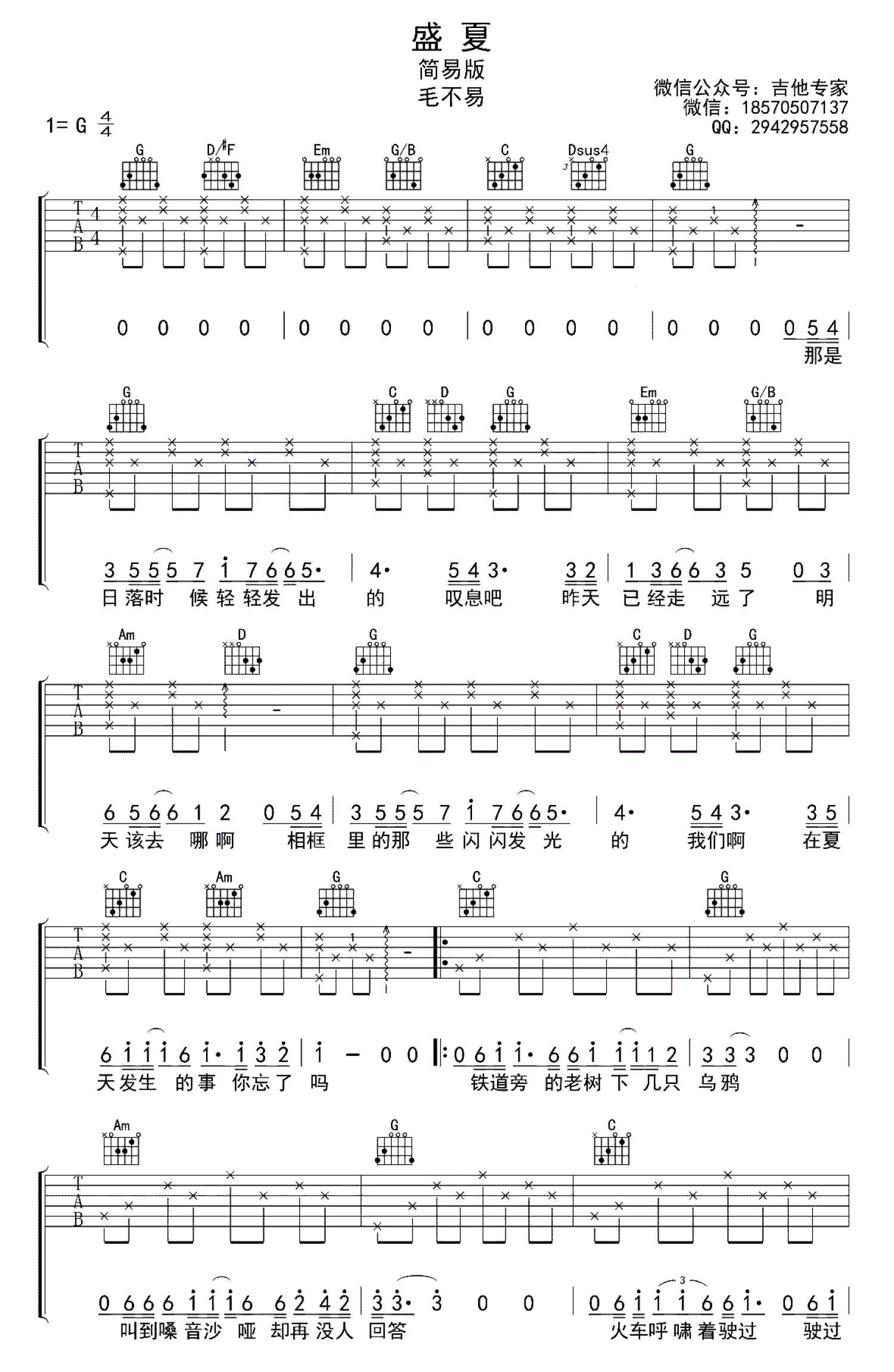 盛夏吉他谱 - 毛不易 - G调吉他弹唱谱 - 简单版