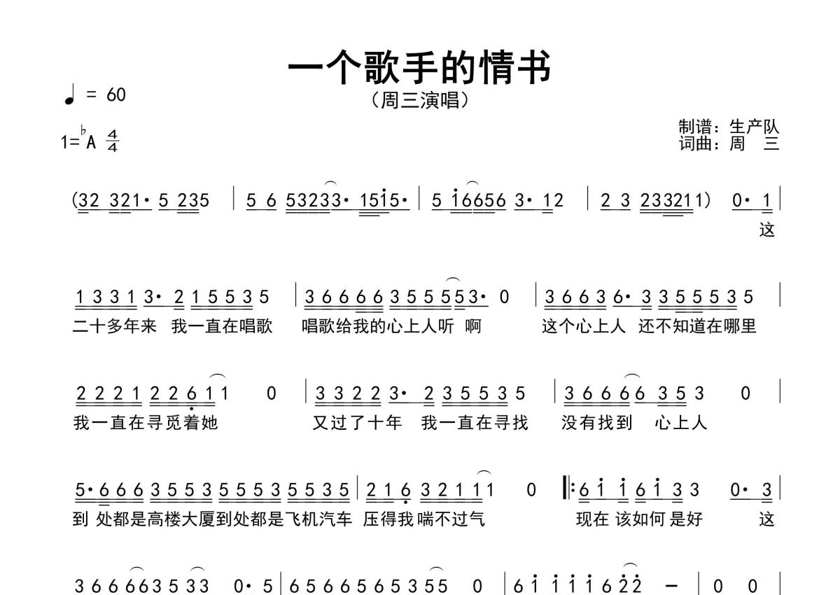 曲谱介绍: 周三《一个歌手的情书》原版简谱,生产队编配出品,共有1张高清图谱,免翻页排版设计。