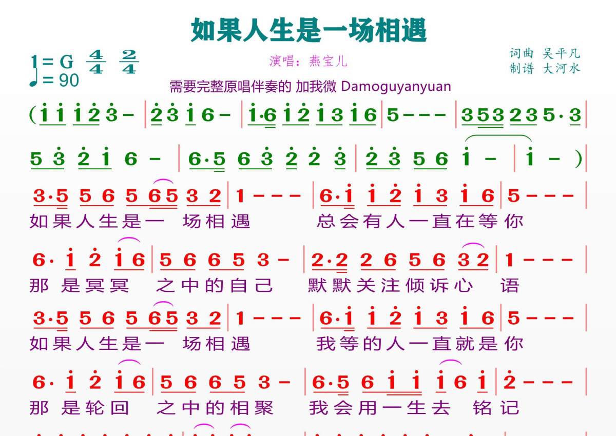 曲谱介绍: 燕宝儿《如果人生是一场相遇》,临海雪原编配出品,共有1张高清图谱,免翻页排版设计。