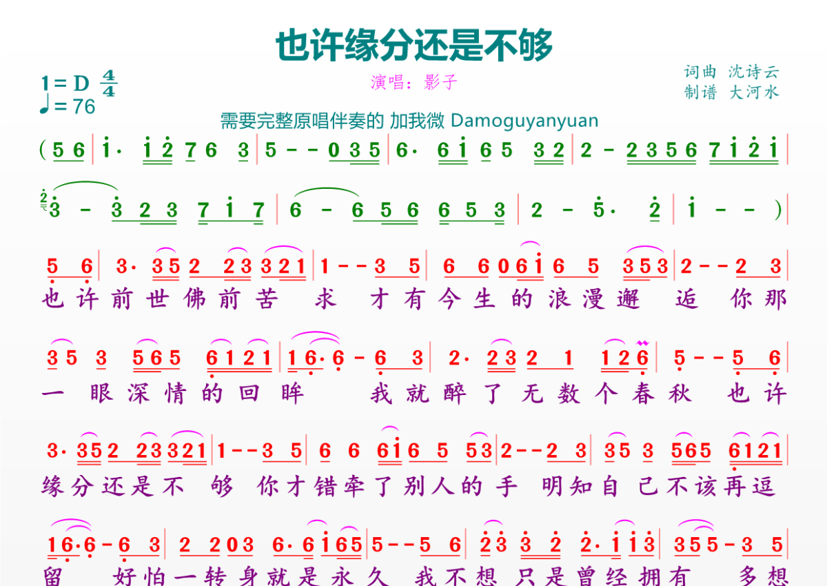 曲谱介绍: 影子《也许缘分还是不够》,临海雪原编配出品,共有1张高清图谱,免翻页排版设计。