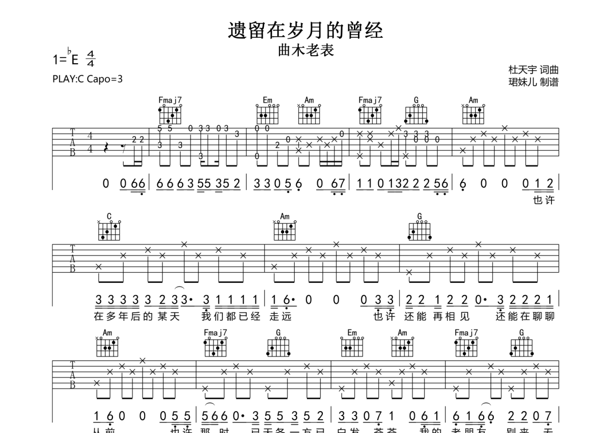 曲谱介绍: 曲木老表《遗留在岁月的曾经》吉他弹唱谱,采用C调指法编配,珺妹儿编配出品,共有2张高清图谱,免翻页排版设计。