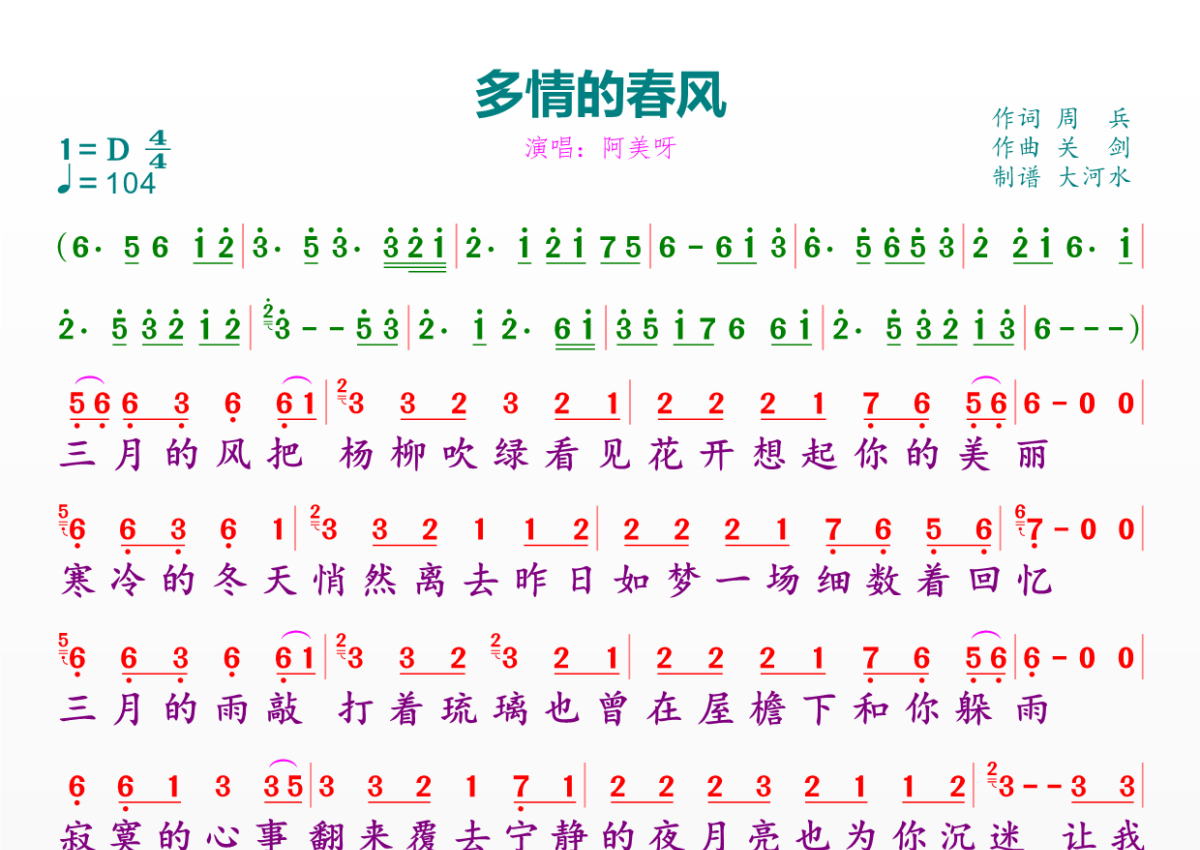 曲谱介绍: 阿美呀《多情的春风》,临海雪原编配出品,共有1张高清图谱,免翻页排版设计。