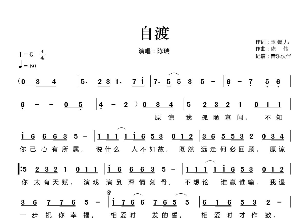 曲谱介绍: 陈瑞《自渡》,音乐伙伴编配出品,共有1张高清图谱,免翻页排版设计。