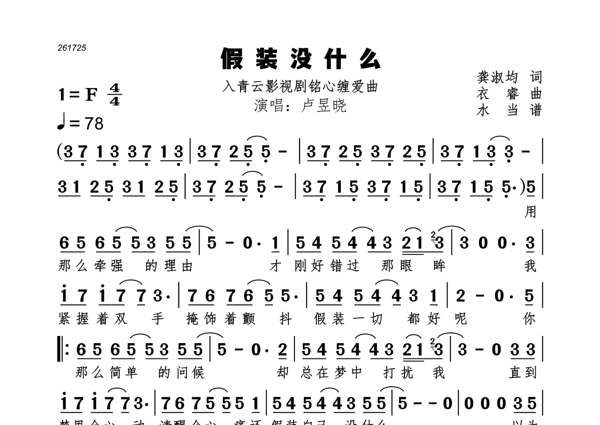 曲谱介绍: 卢昱晓《假装没什么》,水当编配出品,共有1张高清图谱,免翻页排版设计。