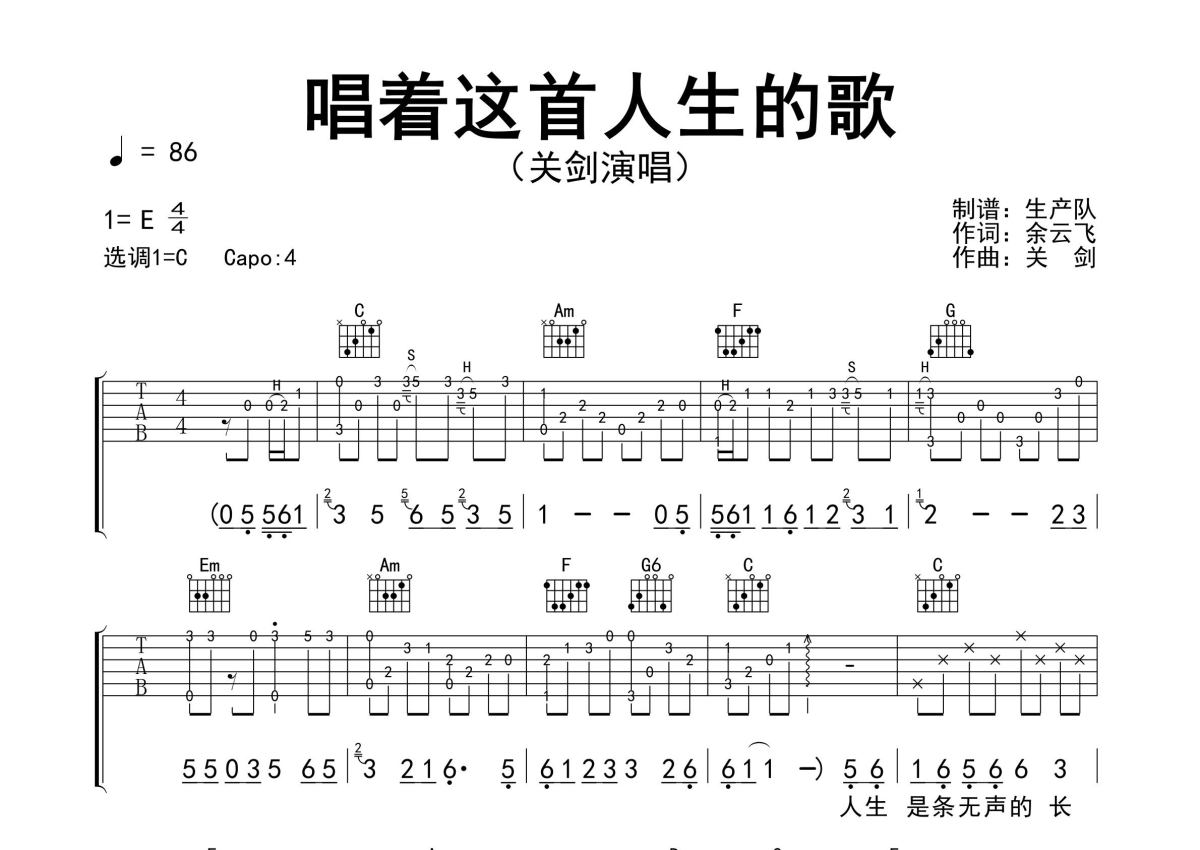 曲谱介绍: 关剑《唱着这首人生的歌》吉他弹唱谱,采用C调指法编配精编完美版,生产队编配出品,共有3张高清图谱。