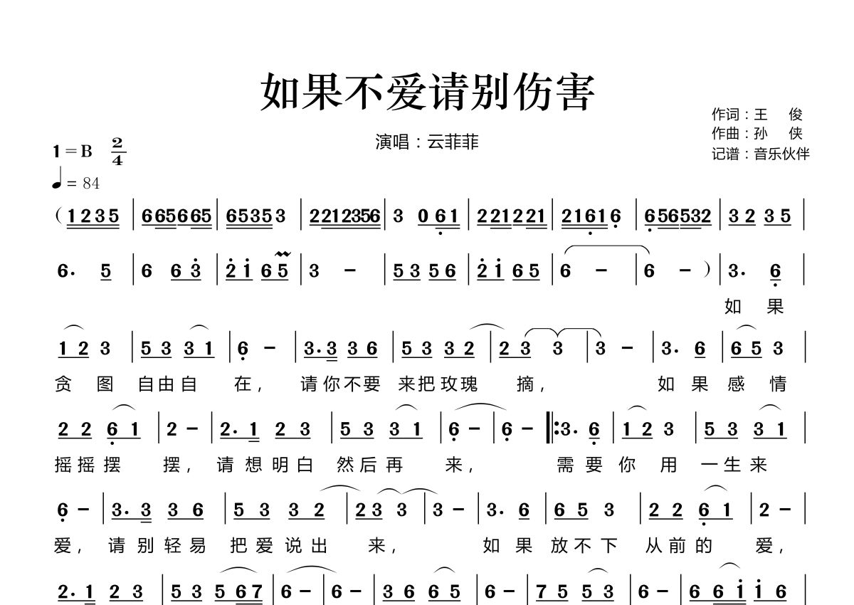 曲谱介绍: 云菲菲《如果不爱请别伤害》,音乐伙伴编配出品,共有1张高清图谱,免翻页排版设计。