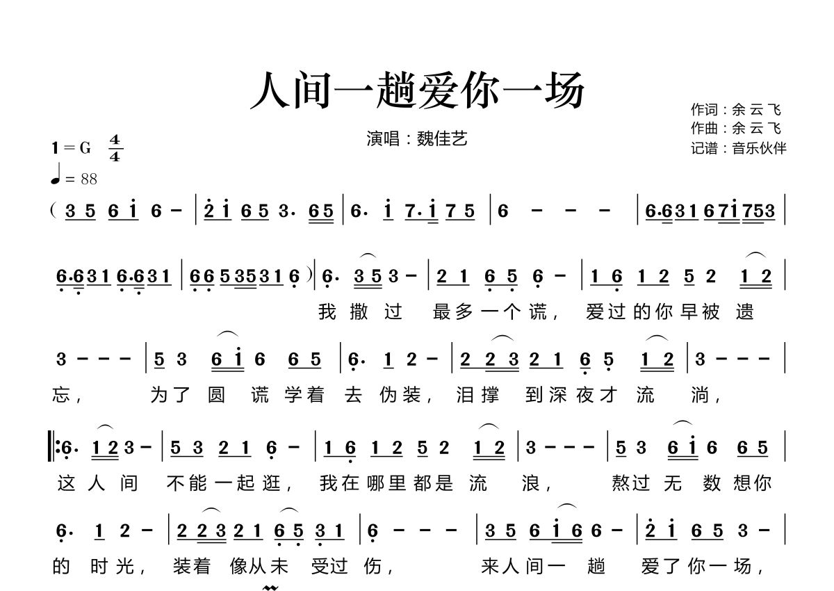 曲谱介绍: 魏佳艺《人间一趟爱你一场》,音乐伙伴编配出品,共有1张高清图谱,免翻页排版设计。