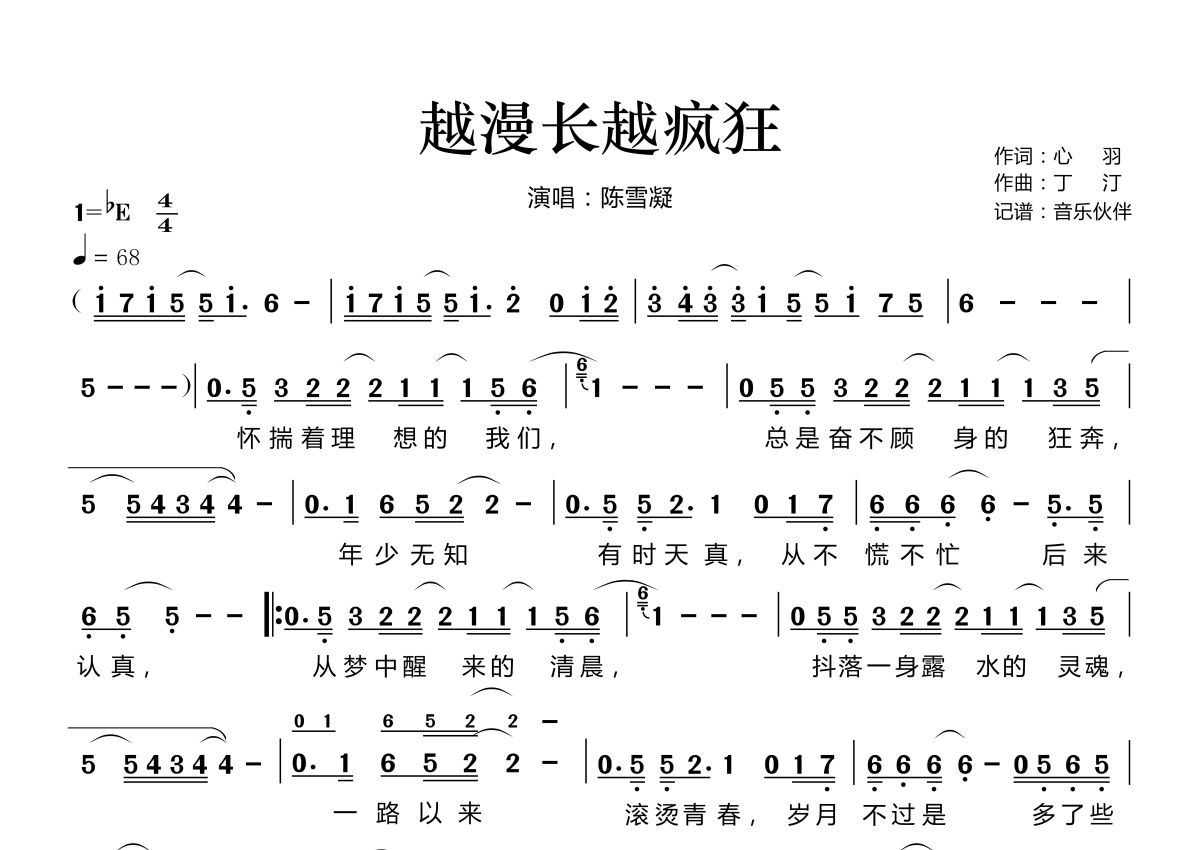 曲谱介绍: 陈雪凝《越漫长越疯狂》,音乐伙伴编配出品,共有1张高清图谱,免翻页排版设计。