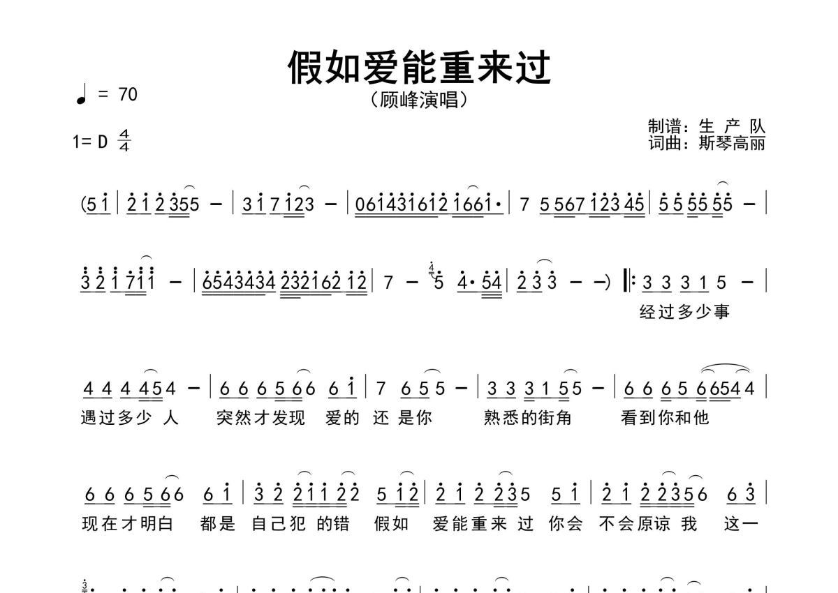 曲谱介绍: 顾峰《假如爱能重来过》原版简谱,生产队编配出品,共有1张高清图谱,免翻页排版设计。