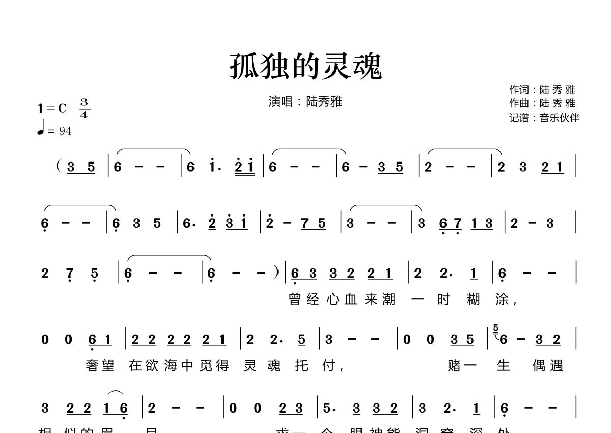 曲谱介绍: 陆秀雅《孤独的灵魂》,音乐伙伴编配出品,共有2张高清图谱,免翻页排版设计。