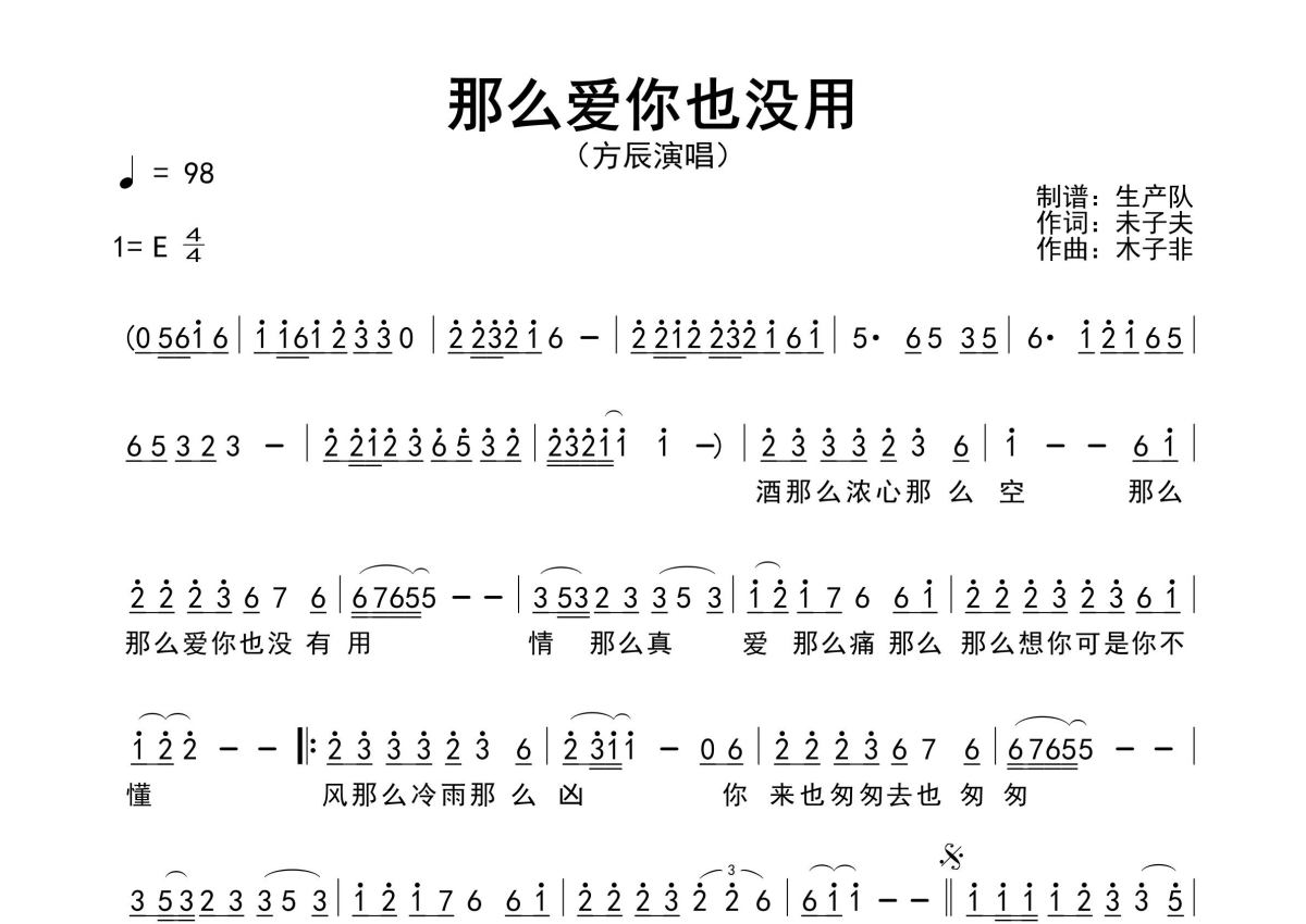 曲谱介绍: 方辰《那么爱你也没用》原版简谱,生产队编配出品,共有1张高清图谱,免翻页排版设计。