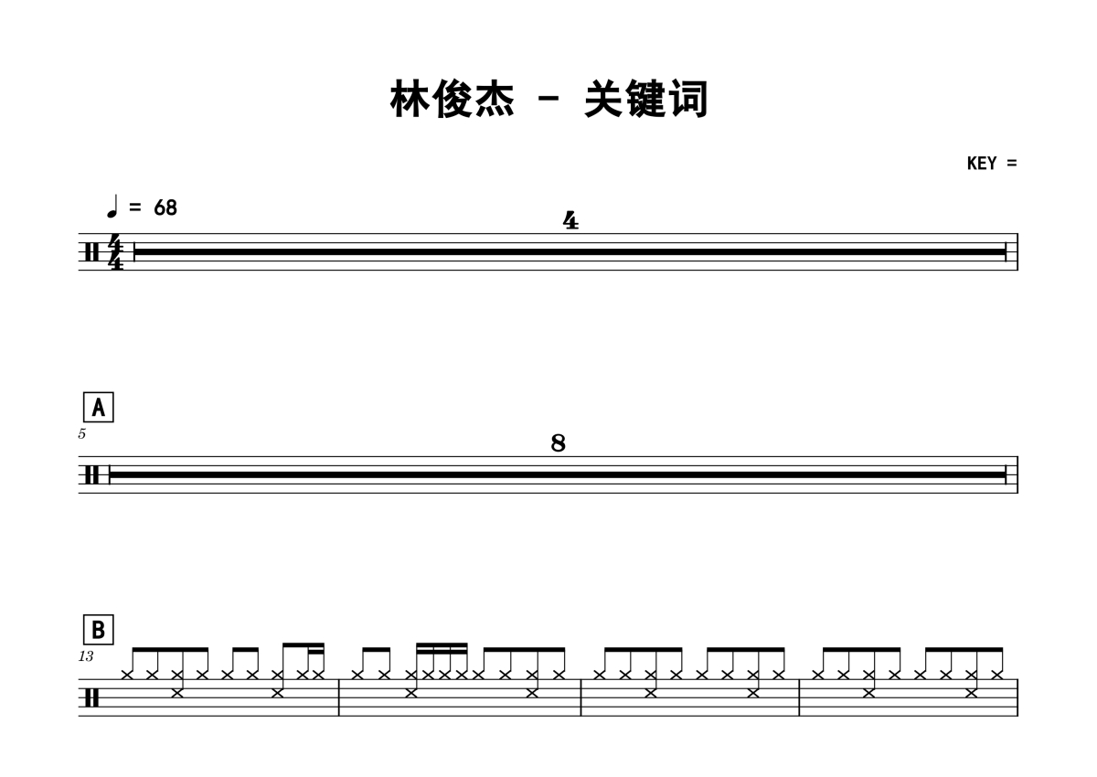 曲谱介绍: 林俊杰《关键词》架子鼓谱,老虎不说谎编配出品,共有2张高清图谱,免翻页排版设计。
