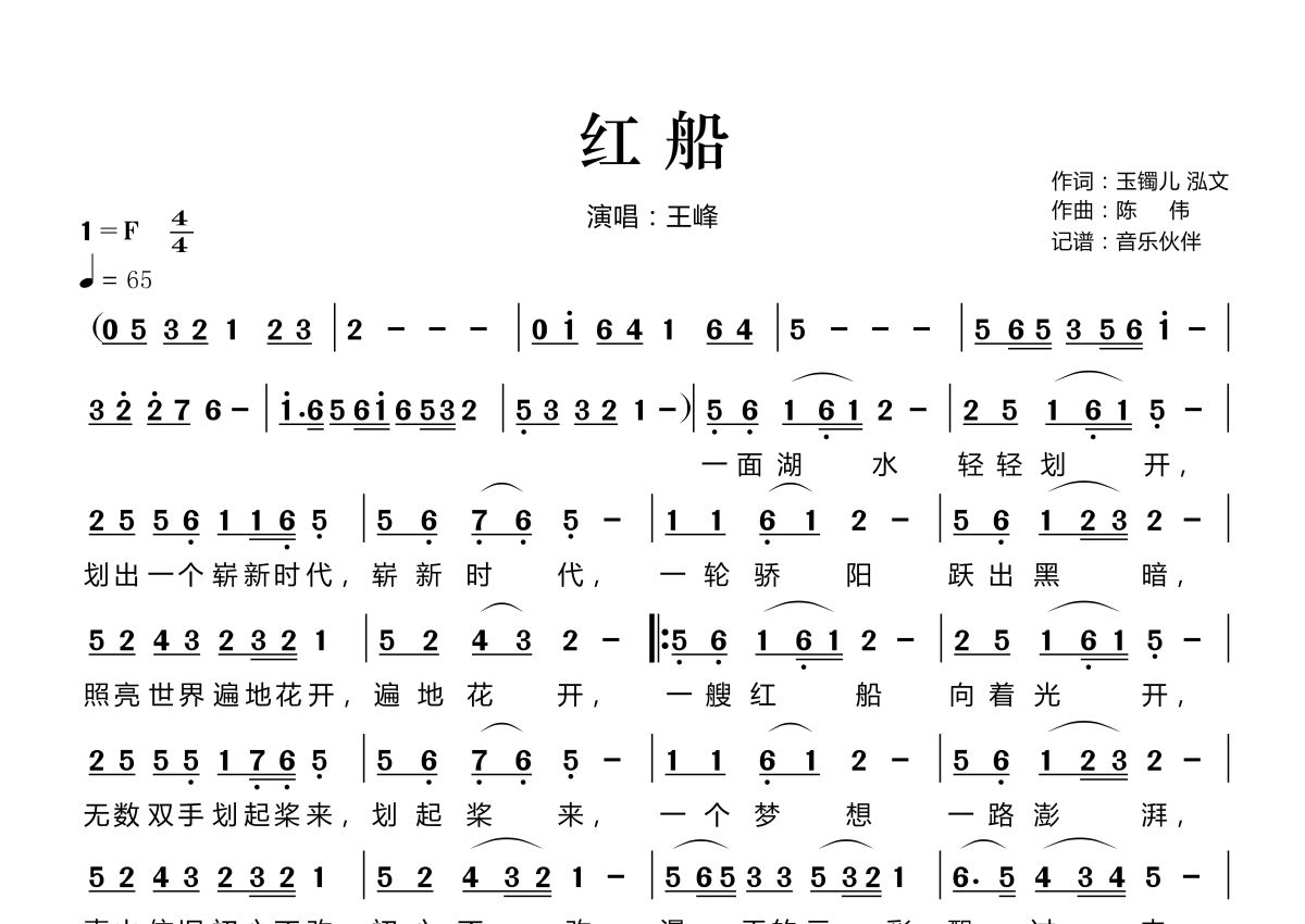 曲谱介绍: 王峰《红船》,音乐伙伴编配出品,共有1张高清图谱,免翻页排版设计。