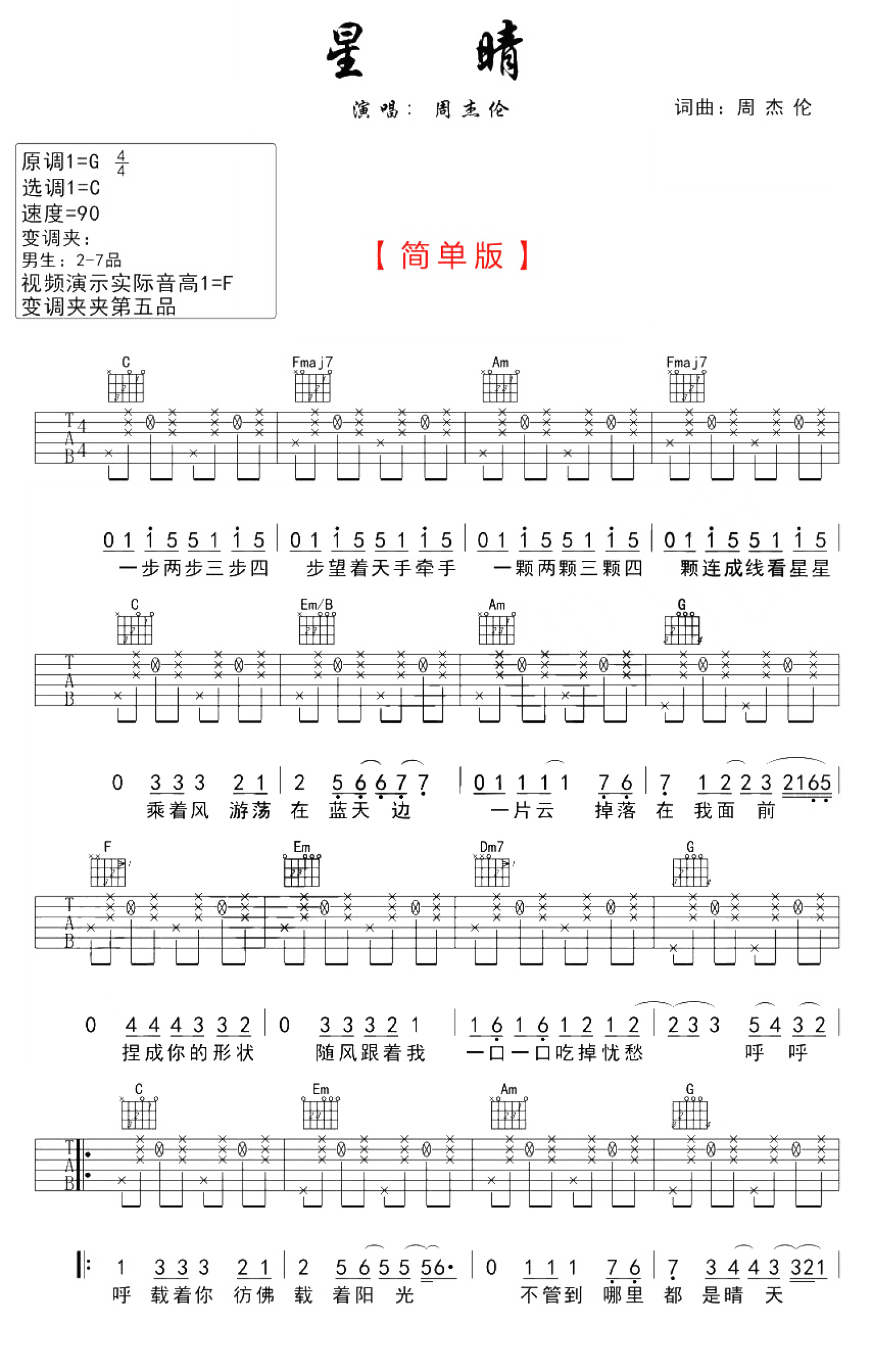 星晴吉他谱 - 周杰伦 - C调吉他弹唱谱