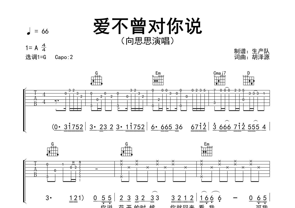 曲谱介绍: 向思思《爱不曾对你说》吉他弹唱谱,采用G调指法编配精编完美版,生产队编配出品,共有3张高清图谱。
