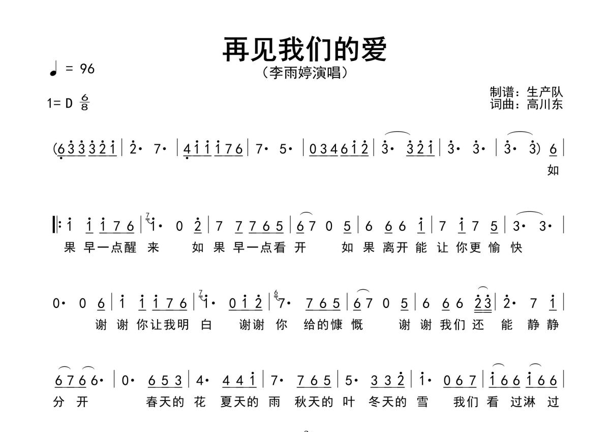 曲谱介绍: 李雨婷《再见我们的爱》原版简谱,生产队编配出品,共有1张高清图谱,免翻页排版设计。