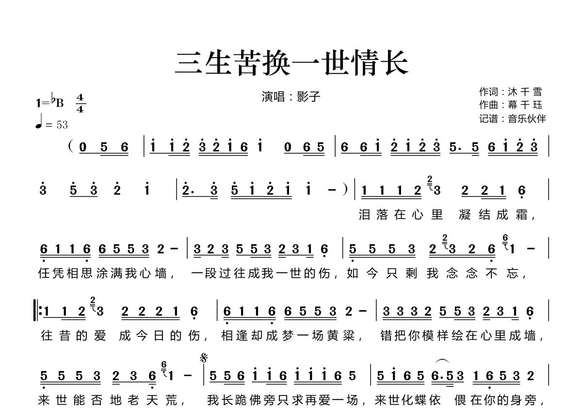 曲谱介绍: 影子《三生苦换一世情长》,音乐伙伴编配出品,共有1张高清图谱,免翻页排版设计。