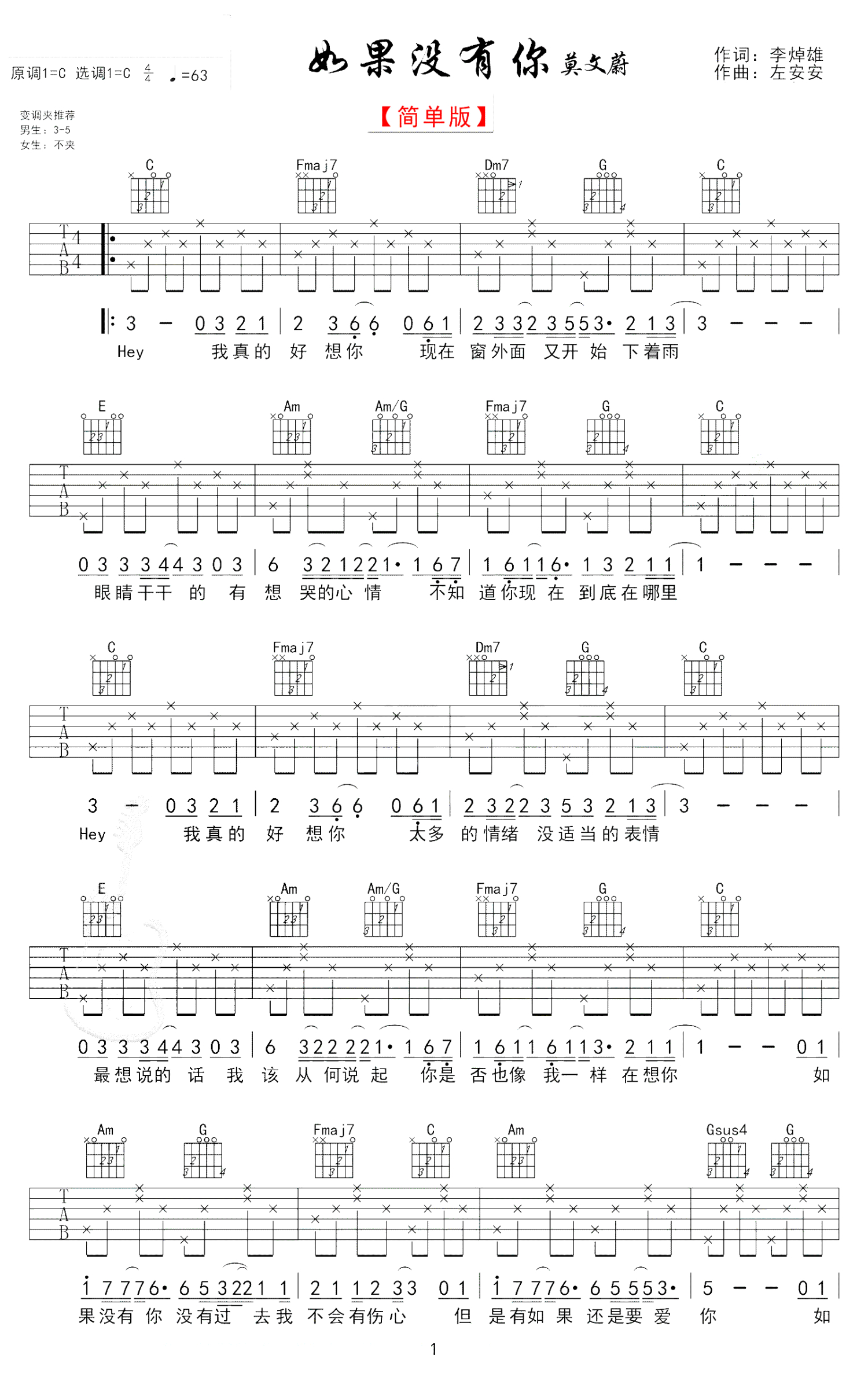 曲谱介绍: 莫文蔚《如果没有你》吉他谱,C调简单版,变调夹男生3-5品,女生不用夹。 最最平淡的话唱出最最动人的情绪,如果没有你,我将会在哪里,我们都在这个孤独的城市里,慢慢追寻着过去,温柔汹涌的旋律,唱出了谁的心思?